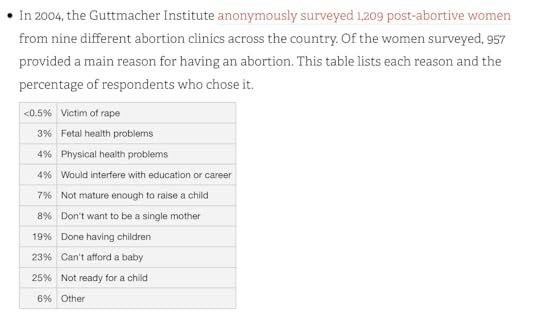 One of the main reasons people get abortions is because they are single moms in poverty and don’t have the means to raise a child. And a child in their lives would derail / compete with the little provision they have for themselves in getting their basic needs met. You can make the argument that they shouldn’t have chose to have sex outside of marriage. I do think this is a valid argument and should not be dismissed. But it’s also not that black and white. I am not in a position to describe the pressure a single woman in poverty might feel to have sex with a man for any number of feelings of security, acceptance, or just plain pressure from the man, or the many situations that could present themselves where birth control wasn’t used or didn’t work.