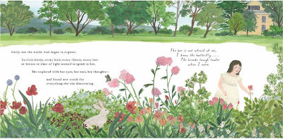What I like about this book: I love the snippets of Emily’s poems lettered on the pages. And how, says author Jennifer Berne, in her poetry you can “hear Emily’s voice echoing through the years” and speaking to all of us who, with pen in hand, look deeply and write about what we discover.