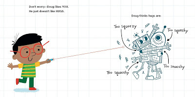 What I like about this book: I love the illustration showing what Doug thinks about hugs: too squeezy and squashy. I love that Carrie Finison shows the great diversity of things that Doug likes. She then shows other ways that Doug lets his friends know that he likes you. Turns out Doug is a master of high fives. But here’s the point – and it’s important: everybody, including your cat, gets to decide for themselves whether they want a hug or not.