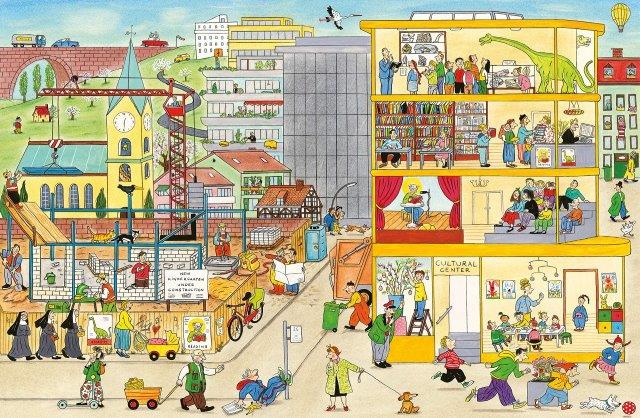 What I like about this book: From one spread to the next, you can follow the various characters around Bustletown – to the farmer’s market, the metro, the town square, the park. Along the way, you might notice that the new Kindergarten is finally under construction.