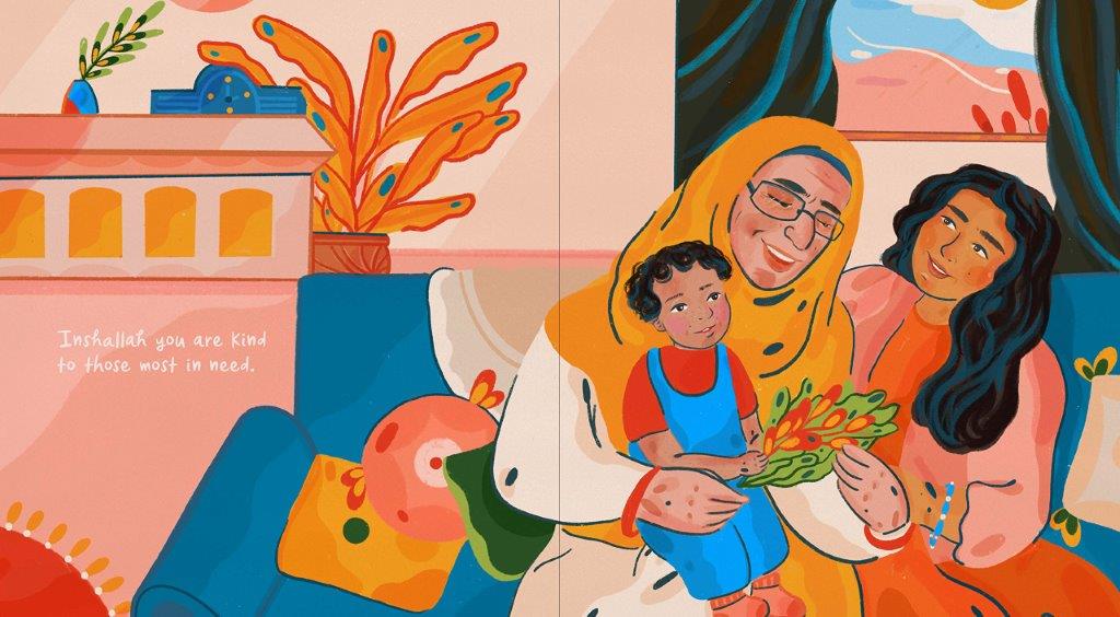 And did I mention the narrative of the illustrations, showing the child growing over time? Illustrator Saffa Khan, who is a print maker, uses digital art for the book – every bit as bold and colorful as her prints.