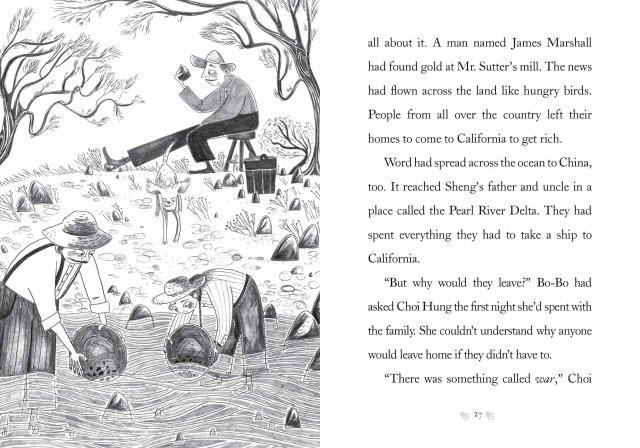 What I like about this book: It is fun to read! And it’s an engaging story – especially if you love stories about heroic dogs. I also like that there is back matter. An author’s note spills the beans about the facts behind the story, and raises a few questions. For example: prospecting is hard work, and most folks who flocked to the gold rush never struck it rich. And yes, thousands of men traveled from China to the gold fields. They left China to escape war and famine, only to face racism in America. Not only did Chinese prospectors have to pay a “foreign miners” tax, white prospectors harassed them and sometimes stole their claims.