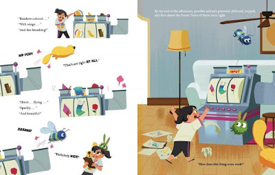 What I like about this book: I like that Katie tries to create the perfect pet. She puts in things that she thinks will create a dragon – but other creatures come out. “How does this thing even work?” she asks. I like how Katie uses deductive reasoning to figure out how each input controls a specific variable: size, color, animal. I like how she changes one variable at a time on the machine and keeps notes until she figures out how the machine works. And I like seeing her final “equation” (or set of inputs) for the perfect pet.