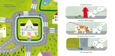 What I like about this book: I love that Marianna Coppo asks really important questions, like what does it mean to be a “good boy?” And what sorts of considerations go into life-altering decisions such as whether to return home or explore the outside world? And I like the end pages: the front endpapers are filled with trophies and doggy toys; the back papers are filled with sticks, puddles, and adventure.
