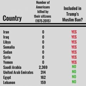 Trump’s mad visa ban, which excludes Saudi Arabia and the Gulf States which are the main financiers, armers, ideologues and exporters of Salafist terrorism, turns out to be imposed on the countries which were on Obama’s watchlist. As the Hastings resolution shows, the anti-Iranian and pro-Saudi madness is bipartisan. To include Iran but exclude Saudi Arabia is further evidence of the twisting of US foreign policy to serve the interests of Saudi Arabia and its ally Israel. This infographic has been compiled based on research by the Cato Institute. I would add the caveat that it refers to terrorist attacks inside America.