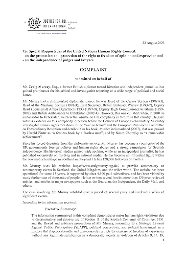 The complaint to the United Nations against my imprisonment for contempt of court has now been submitted. This is the first time I have been able to state the case without the compulsory use of Scottish counsel, who were astonishingly timid of criticising Lady Dorrian or detailing Sturgeon’s conspiracy, its personnel, and how it worked.