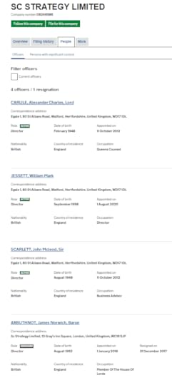 Here is the clincher in this episode of how the Establishment functions. Carlile went on to found a company, SC Strategy Ltd, in partnership with Sir John Scarlett, former Head of MI6, who obtained that position as the main author of the infamous “Dodgy dossier” of lies on Iraqi Weapons of Mass Destruction. They were joined for a while as a Director of that company by Lord Arbuthnot, former Tory junior defence minister and husband of Lady Arbuthnot.