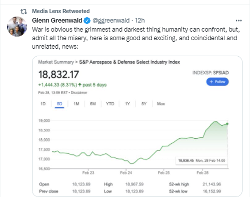 We see this operating today. The war profiteers have already made billions from the war in Ukraine. Look at this surge in defence stocks.