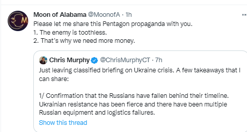 It says something very interesting about mass psychology that our political and media classes are able to convince the population, both that Russia is an incredible threat to us in our homes, and that the gallant Ukrainians can hold the Russians off. The western political and media class, almost universally, are managing both to crow that Russia is militarily weak, and to claim that we need to throw yet more money at the military industrial complex. As nicely observed by Moon of Alabama.