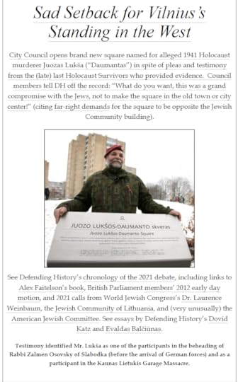 I recommend to you the website www.defendinghistory.com, run by the admirable David Katz, which is a large and valuable resource on this website from a Lithuanian Jewish perspective that cannot remotely be dismissed as Russian or left wing propaganda. The front page currently features the December 2021 naming of a square in the capital after Lithuanian “freedom fighter” Juokas Luksa “Daumantas”, a man who commenced the massacre of Jews in Vilnius ahead of the arrival of German forces.
