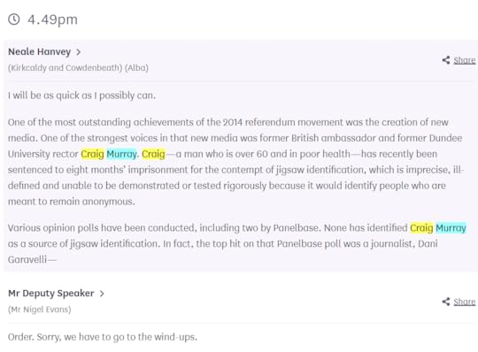 Yesterday the House of Commons was debating “safety of journalists”. After reams of MP waffle about evil foreigners, the Alba Party was allocated 60 seconds and tried to use it to raise my case.