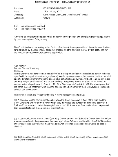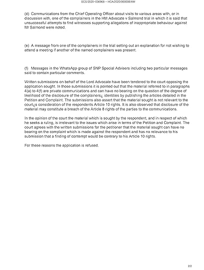 I did not jigsaw identify anyone.The Lord Advocate argues that I am responsible for tweets in reply to my own tweets. We argue this is not true – I am not the publisher of twitter – and would set a very dangerous precedent.The Crown is specifically arguing that the bar for jigsaw identification is that any one single individual with specialist knowledge would be likely to identify a witness from my writing; this could be, for example, an individual who worked in the same office, or the doorman at Bute House who knew who was there on which day. My defence is that jigsaw identification means likely to identify to the public. If the Crown’s definition were accepted, there would be a massive chilling effect on journalism.The mainstream media demonstrably gave more jigsaw identification information than I did, notably, but not only, Dani Garavelli and Kirsty Wark. I have been singled out for prosecution on political grounds.The court order protecting identities did not come into being before 10 March 2020. Most of the Crown’s alleged examples are before this date. We absolutely deny my articles enable jigsaw identification, but even if they did they were not illegal at the time of publication.Up until 10 March 2020, had I wished to publish identities I could have done so quite legally in the articles before that date which the Lord Advocate cites. Unlike England, there is no law in Scotland barring publication of witness identity absent a specific court order. The fact I did not do so in the year between my learning identities and the ban coming into force, in several articles on the case where I could legally have published the identities, make nonsense the Lord Advocate’s contention that I deliberately gave clues.After Alex Salmond’s acquittal the false accusers continued to take advantage of the court anonymity order to decry and undermine the jury’s verdict and malign Alex Salmond. Given the high positions of influence the women hold, I decided to challenge in court whether there was not a public interest in stopping this behaviour, in this unique case greater than the important general public interest in protecting identities. I did not take it upon myself to determine this, but commissioned and paid for a senior advocate to prepare a case for the judge to decide. I received the draft application from my senior counsel but the application was postponed by Covid. I would not have taken this expensive and responsible legal route if I was leaking the identities illegally as alleged.c) Juror Exclusion