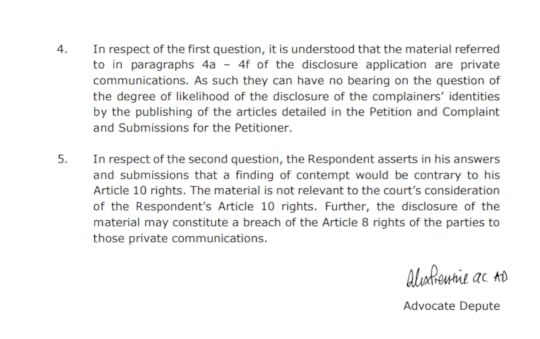 3) The High Court has agreed with the Lord Advocate that these messages are irrelevant to my trial and do not go to my Article 10 rights of free speech. The High Court notably refrained from endorsing the Lord Advocate’s argument that they are “private messages” and that Murrell and Ruddick are protected from their disclosure under Article 8.