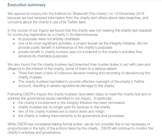 The Charity Regulator also found that the Integrity Initiative, run by the Institute for Statecraft, was sending out party political tweets. All of this activity was of course carried out with taxpayers money, the Integrity Initiative being funded by the FCO, the MOD, and the security services.