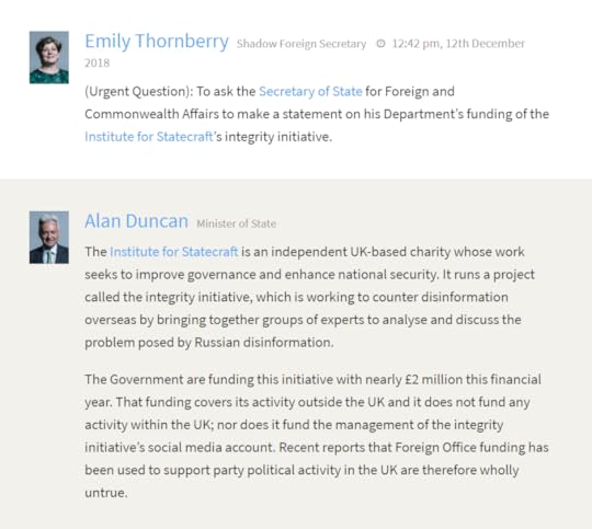 All of the “expert witnesses” before the committee feature in the leaked Integrity Initiative documents as part of Integrity Initiative activites. They are all engaged in doing precisely what they here accuse the Russians of doing. The best exposition, to the highest academic standards, of the fascinating leaked documents of the Integrity Initiative operation is by the Working Group on Syria, Propaganda and the Media. You can very happily spend an hour looking through their report.