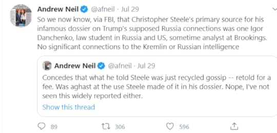 Since then the dossier has simply fallen apart. Steele has been successfully sued by people named in the dossier. The lawyer Michael Cohen has shown that he was definitively not in Prague on the date Steele claimed he was meeting Russian hackers there, and indeed has never been to Prague. Most telling of all, it turns out that most of the content of the dossier was simply a compilation of the gossip of the Russian emigre community in Washington by Igor Danchenko, formerly a junior staff member at the Brookings Institute, a liberal foreign policy thinktank.