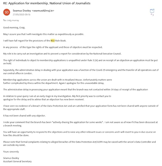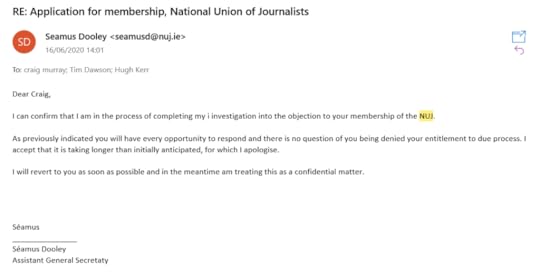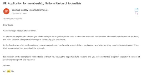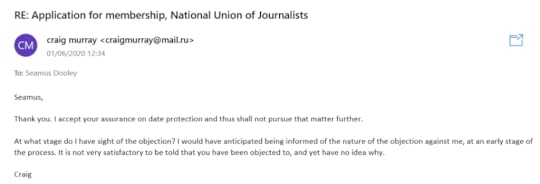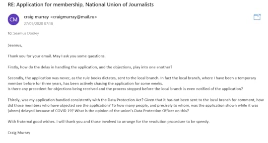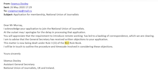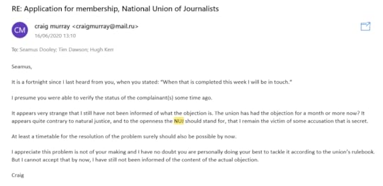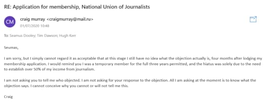 But how can this happen? The NUJ claim that the delay in dealing with the objections (plural) is caused by the need to locate the objectors and verify their standing in the union. So if these objectors are so diverse and unknown to NUJ HQ, how did they find out about my membership application in order to object to it? The application was never sent out for comment or posted anywhere. The most obvious explanation is that somebody within the NUJ staff has tipped off some group to object.