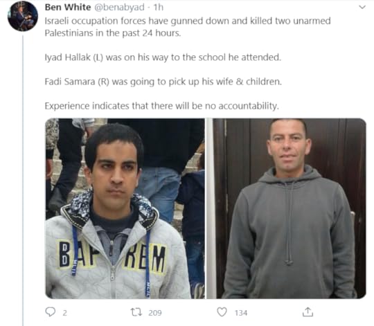 There is a stark contrast between the justified international outrage at Floyd’s death, and the unremarked killing of just a couple more Palestinians. I recommend this twitter thread by the ever excellent Ben White, and the links it gives. Ben does not mention that Iyad, on the left, was on his way to classes for those with special needs when he was chased and gunned down by Israeli soldiers.