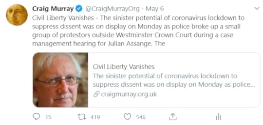The sinister potential of coronavirus lockdown to suppress dissent was on display on Monday as police broke up a small group of protestors outside Westminster Crown Court during a case management hearing for Julian Assange. The dozen protestors, who included Julian’s father John Shipton, were all social distancing at least 2 metres apart (except where living in the same household). The police did not observe social distancing as they broke up this small and peaceful protest.