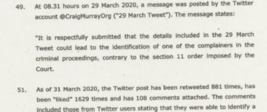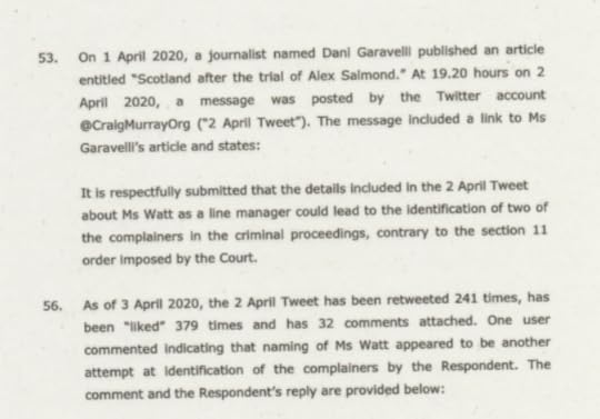 Right at the start, this wording gives away the motivation. The conspirators have still not psychologically processed the fact their attack on Alex Salmond was foiled by the jury. The Crown is now coming at Mark Hirst and at me in an effort to get some kind of victory from this massive waste of public resources. The conspirators seek to assuage their massive humiliation in the failure of a prosecution that stank and quite obviously ought never to have been brought.