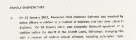 Actually, you don’t have to go past the very first sentence of the indictment to understand what is happening here. It reads “On 23 January 2019, Alexander Elliott Anderson Salmond was arrested by police officers in relation to a number of incidents that had taken place in Scotland.”
