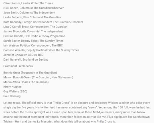 There is no other possible conclusion than that these figures were aware of the “Philip Cross” operation when it was still apparently nothing but an extremely obscure man who liked obsessively editing Wikipedia and retweeting Nick Cohen and David Aaronovitch (his most frequent tweets). My intuition is – and this is not fact, but a working hypothesis that fits known facts to date – that the many MSM journalists who were, for no apparent reason, following the obscure “Philip Cross” twitter account, were not merely au fait with, but a part of, the Wikipedia editing operation that hid behind “Philip Cross” and his IP address.