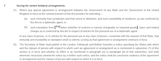 I should straighten one wrinkle. I understand that the current fig leaf which UK government lawyers are attempting to shrink behind is the provision in the 1964 Diplomatic Privileges Act authorising bilateral arrangements which confer immunities over and above those conferred by the Vienna Convention. There is indeed such a provision, at article 7 of the Act.
