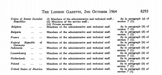 But note this: it only provides for special bilateral arrangements already in place “at the commencement of the Act”, ie before 1964. Furthermore those bilateral arrangements must, as specified in the legislation, be listed in the London Gazette. I searched the Gazette, which was as little fun as it sounds. Journalism is tough work if you do it properly, which is presumably why the media no longer even pretend to do it. Eventually I tracked down the list of bilateral arrangements under the Diplomatic Privileges Act on page 8,292 of Issue 4,351 of the London Gazette.
