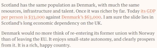 Scots are now very significantly poorer than the Irish, the Norwegians, the Swedes, the Danes, the Icelanders or any of their obvious comparators. Every one of those nations is in the top 10 of the UN Human Development Index. The UK is not, and Scotland is below the mean for the UK. It is not because Scots are stupid or feckless, it not because of climate and it is certainly not a lack of natural resources. It is because of the draining away of human and physical resource by London over centuries.