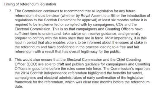 In particular the Electoral Commission argues at para 7 of its submission for a period of “at least six months” between the passing of the legislation and the start of the campaign. This is so that campaigners and administrators can learn and thoroughly understand the rules before the campaign gets underway.