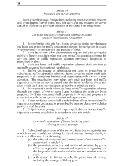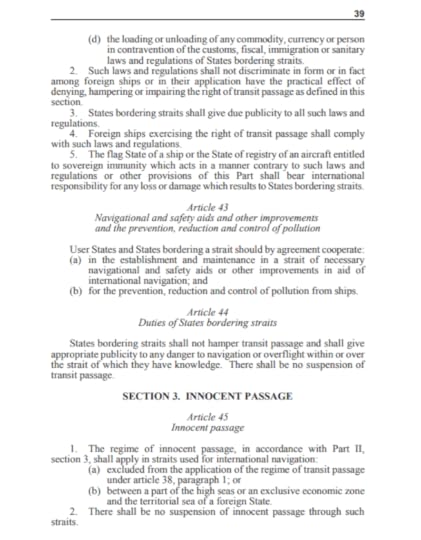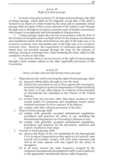 Please note that the right of passage through straits is here absolute, in a UN Convention which is one of the base blocks of international law. It does not state that the right to transit through straits can be subject to any sanctions regime which the coastal state chooses to impose; indeed it is clearly worded to preclude such coastal state activity. Nor can it be overridden by any regional grouping of which the coastal state is a member.