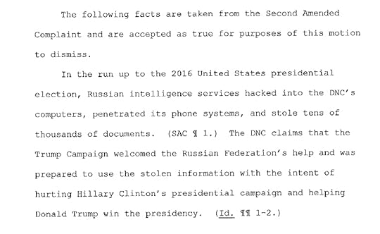 The consequence of this procedure is of course that in this judgement Koeltl is accepting the DNC’s “facts”. The judgement is therefore written entirely on the assumption that the Russians did hack the DNC computers as alleged by the plaintiff (the Democratic National Committee), and that meetings and correspondence took place as the DNC alleged and their content was also what the DNC alleged. It is vital to understand in reading the document that Koeltl is not stating that he finds these “facts” to be true. Doubtless had the trial proceeded many of them would have been challenged by the defendants and their evidentiary basis tested in court. It is simply at this stage the only question Koeltl is answering is whether, assuming the facts alleged all to be true, there are grounds for trial.