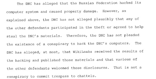 The key finding is this. Even accepting the DNC’s evidence at face value, the judge ruled that it provides no evidence of collusion between Russia, Wikileaks or any of the named parties to hack the DNC’s computers. It is best expressed here in this dismissal of the charge that a property violation was committed, but in fact the same ruling by the judge that no evidence has been presented of any collusion for an illegal purpose, runs through the dismissal of each and every one of the varied charges put forward by the DNC as grounds for their suit.