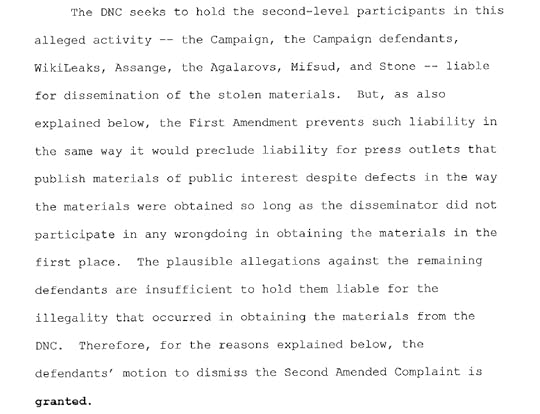 Judge Koeltl also notes firmly that while various contacts are alleged by the DNC between individuals from Trump’s campaign and individuals allegedly linked to the Russian government, no evidence at all has been put forward to show that the content of any of those meetings had anything to do with either Wikileaks or the DNC’s emails.