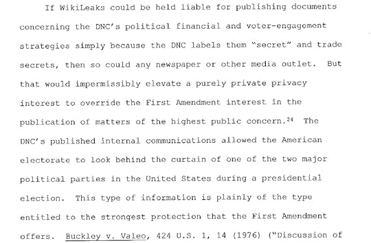Judge Koeltl goes further and asserts that Wikileaks, as a news organisation, had every right to obtain and publish the emails in exercise of a fundamental First Amendment right. The judge also specifically notes that no evidence has been put forward by the DNC that shows any relationship between Russia and Wikileaks. Wikileaks, accepting the DNC’s version of events, merely contacted the website that first leaked some of the emails, in order to ask to publish them.