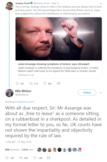 Professor Melzer is the United Nations Special Rapporteur on Torture. Professor Melzer is Swiss. He is an extremely distinguished lawyer and Professor of International Law at the University of Glasgow in addition to Professor of International Humanitarian Law at the Geneva Academy. He served 12 years as a Red Cross Delegate. There is no doubting either Professor Melzer’s expertise or his independence in this matter.