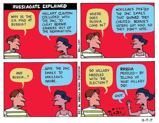 This cartoon seems to me very apposite. The capacity of the mainstream media repeatedly to promote the myth that Russia caused Clinton’s defeat, while never mentioning what the information was that had been so damaging to Hillary, should be alarming to anybody under the illusion that we have a working “free media”. There are literally hundreds of thousands of mainstream media articles and broadcasts, from every single one of the very biggest names in the Western media, which were predicated on the complete nonsense that Russia had conspired to install Donald Trump as President of the United States.