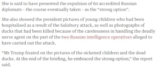 But today we learn from the Guardian (quoting the New York Times) that Donald Trump was only convinced to back the UK government line after being shown photos of dead ducks and hospitalised children by CIA director Gina Haspel.