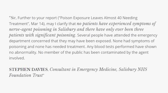 Dr Stephen Davies of Salisbury Hospital’s letter of 16 March 2018 to the Times has been explained away as poorly written or edited, in relation to the cause of the Skripals’ illness. But be that as it may, one thing the doctor’s letter does without any shadow of a doubt, is rule out the possibility of hospitalised children.