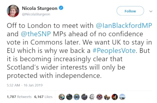 For good measure, Nicola Sturgeon also played politics with a statement after last night’s vote which, remarkably, did not mention the word “Independence” at all. Sturgeon now appears entirely focused on keeping England and Wales inside the European Union against the will of the English and Welsh people, as opposed to having a clear and fixed aim of achieving Scottish Independence from this debacle.