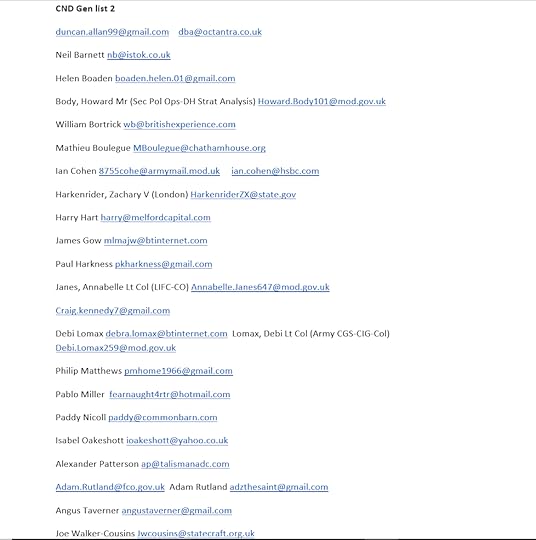 The list is headed CND gen list 2. CND is Christopher Nigel Donnelly, Director of the Institute for Statecraft and the Integrity Initiative and a very senior career Military Intelligence Officer.