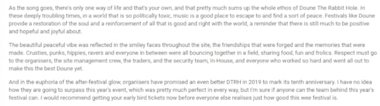While this review from eFestivals picked up on an atmosphere which precisely matches my description before the Festival of why it is important to me and why I find renewal there (and no, I don’t know the author):