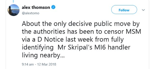 At the very beginning of the of the Skripal incident, the security services blocked by D(SMA) notice any media mention of Pablo Miller and told the media not to look at Orbis and the Steele dossier on Trump, acting immediately to get out their message via trusties in the BBC and Guardian. Gordon Corera, “BBC Security Correspondent”, did not name the source who told him to say this, but helpfully illustrated his tweet with a nice picture of MI6 Headquarters.