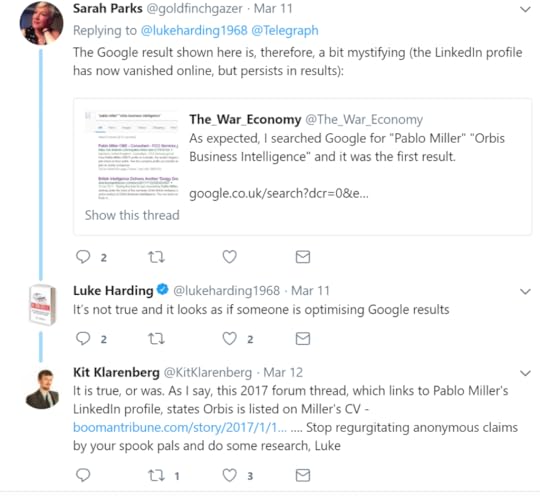 A number of people replied to Harding’s tweet to point out that this was demonstrably untrue, and Pablo Miller had listed his employment by Orbis Business Intelligence on his Linkedin profile. That profile had just been deleted, but a google search for “Pablo Miller” plus “Orbis Business Intelligence”, without Linkedin as a search term, brought up Miller’s Linkedin profile as the first result (although there are twelve other Pablo Millers on Linkedin and the search brought up none of them). Plus a 2017 forum discussed Pablo Miller’s Orbis connection and it both cited and linked to his Linkedin entry.