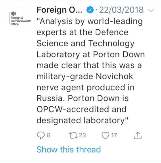 I have now received confirmation from a well placed FCO source that Porton Down scientists are not able to identify the nerve agent as being of Russian manufacture, and have been resentful of the pressure being placed on them to do so. Porton Down would only sign up to the formulation “of a type developed by Russia” after a rather difficult meeting where this was agreed as a compromise formulation. 16 March 2018