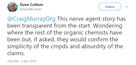 Motorola sales agent Gary Aitkenhead – inexplicably since January, Chief Executive of Porton Down chemical weapons establishment – said in his Sky interview that “probably” only a state actor could create the nerve agent. That is to admit the possibility that a non state actor could. David Collum, Professor of Organo-Chemistry at Cornell University, infinitely more qualified than a Motorola salesman, has stated that his senior students could do it. Professor Collum tweeted me this morning.