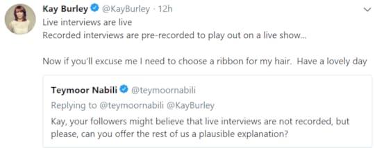 Kay Burley then appeared to suggest in reply to persistent questioning from Teymoor Nabili that Sky News could not put the interview online as they did not record it and do not hold a copy, which is plainly untrue (and would be illegal under their broadcast license).