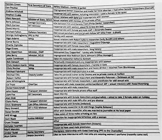 It is difficult to understand the provenance of this “sex list” of Tory MPs. What was the standing of the junior Tory researchers who allegedly compiled it, and at whose behest? Assuming this copy is genuine, we know that at least some of it is accurate because individuals like Mark Garnier have admitted the detail of the allegation. But I publish it as a matter of intense public interest at the moment, and I publish it as evidence that this is what is alleged. This list is already extremely widely available online. I am not in any sense endorsing or promoting as true any of the specific individual allegations, which may be groundless nonsense. I understand that in some cases these allegations are strongly denied.