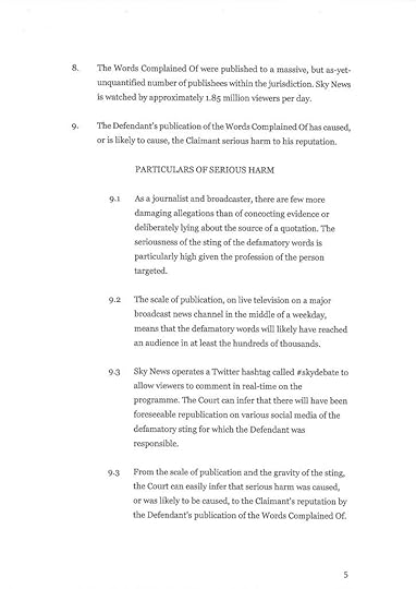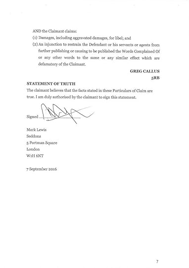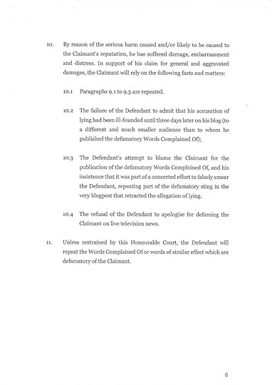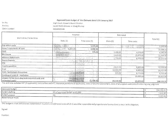 This next document goes to the heart of the astonishing system of repression that is English libel law. These are the claimants’ judge approved costs of £104,000, which should I lose I might well have to pay, in addition to my own costs plus assessed damages. The wildly disproportionate effect of using a libel claim to bankrupt somebody and destroy their lives needs to be highlighted. This means for the wealthy to silence and ruin the poor needs to be exposed for what it is.