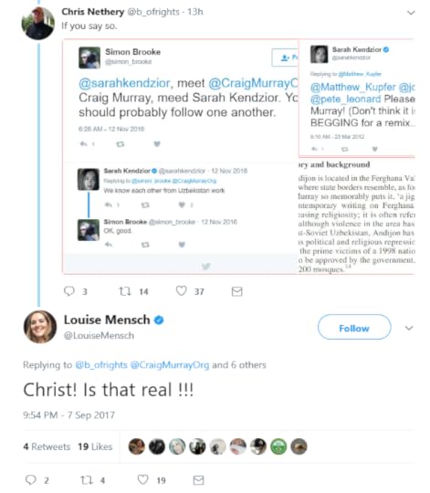 Louise has taken up online with one of the crazed self-styled security experts who is jumping on the anti-Russian bandwagon in the United States, named Chris Nethery. Mr Nethery believes and has convinced Ms Mensch (so far as I can judge) that Sarah Kendzior, Uzbek opposition leader Mohammed Solih and I are members of a Russian intelligence cell which is undermining America. Those tweets appear to the rather strange mind of Ms Mensch to prove compelling evidence of this.